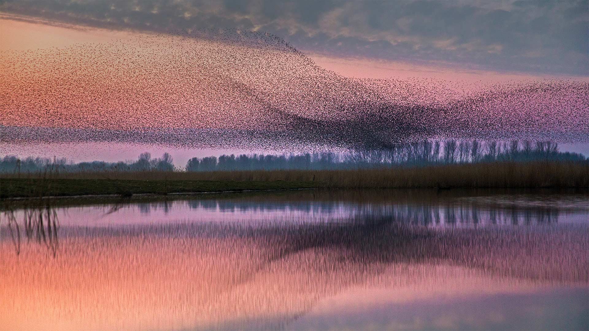 After the nesting and breeding seasons of spring and summer have passed, starlings become highly social birds, often gathering in flocks that number in the thousands. These flocks sometimes take the form of a murmuration—when the birds form a group large and dense enough that they appear to move together as a single organism, even if the movements seem arbitrary. Though scientists still don"t quite understand how the individual starlings in a murmuration coordinate their tight, fluid formations, the behavior is thought to be a way to confuse predators.