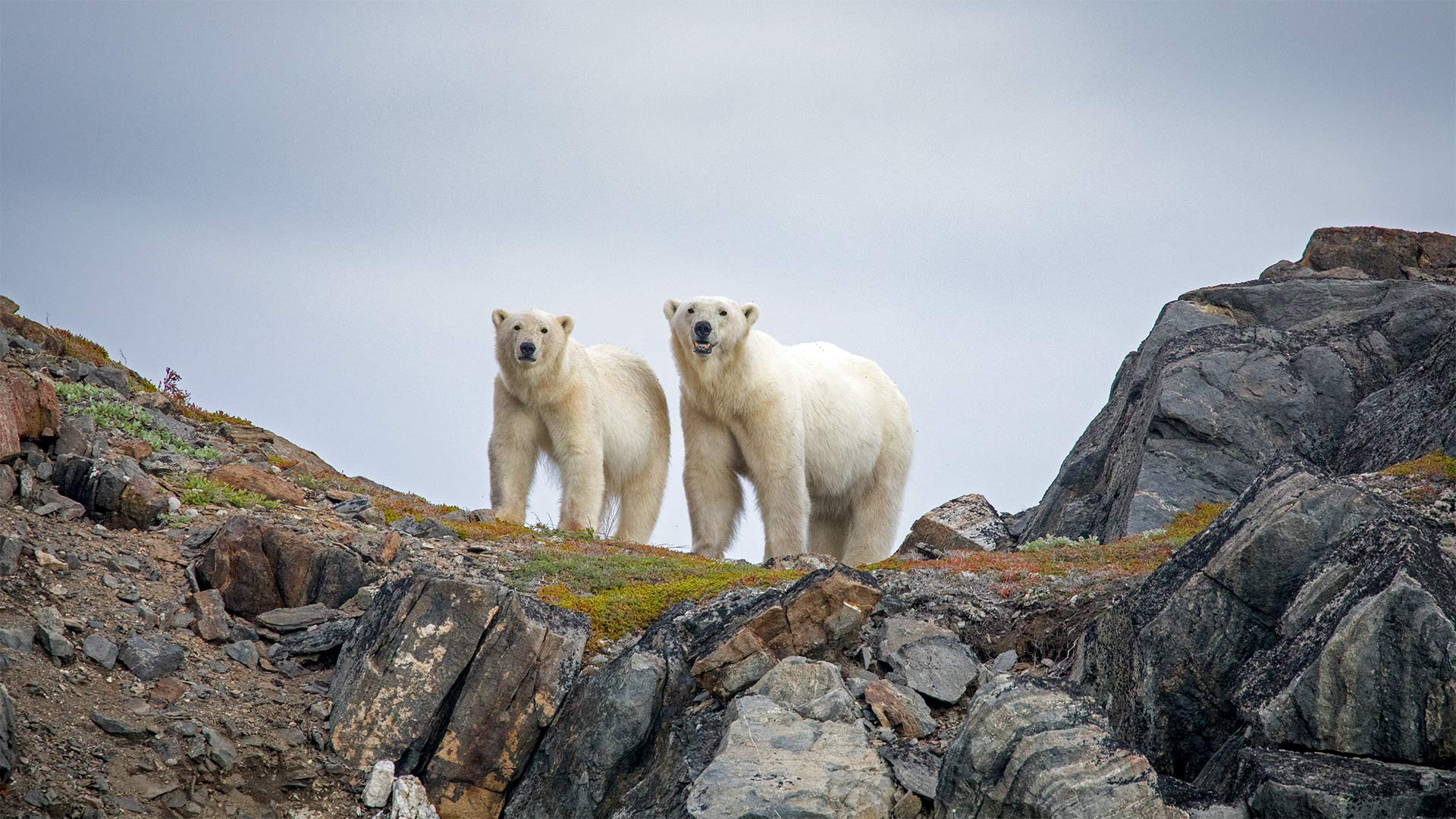 These polar bears seem to be just as happy as we are to visit Torngat Mountains National Park today. Located in Canada at the tip of the Labrador Peninsula and bordering the Labrador Sea, the park is accessible only by boat, charter plane, or helicopter. The name "Torngat" comes from the Inuktitut word "Tongait," meaning "place of spirits." The Inuit have lived here for centuries and still fish and hunt across the wide tundra valleys where these polar bears roam. This time of year, polar bears are waiting for the sea ice to form so they can venture out onto the Labrador Sea to hunt for seals.