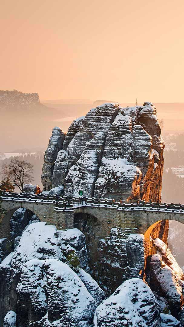 Sandwiched between soaring pinnacles of sandstone, Bastei Bridge is a highlight of Saxon Switzerland National Park. But don"t be fooled by the park"s name because we"re not in Switzerland; we"re hundreds of miles away in eastern Germany, close to the border with the Czech Republic. The name comes from two Swiss artists who visited the area in the second half of the 18th century and felt the picturesque upland scenery was reminiscent of their homeland.