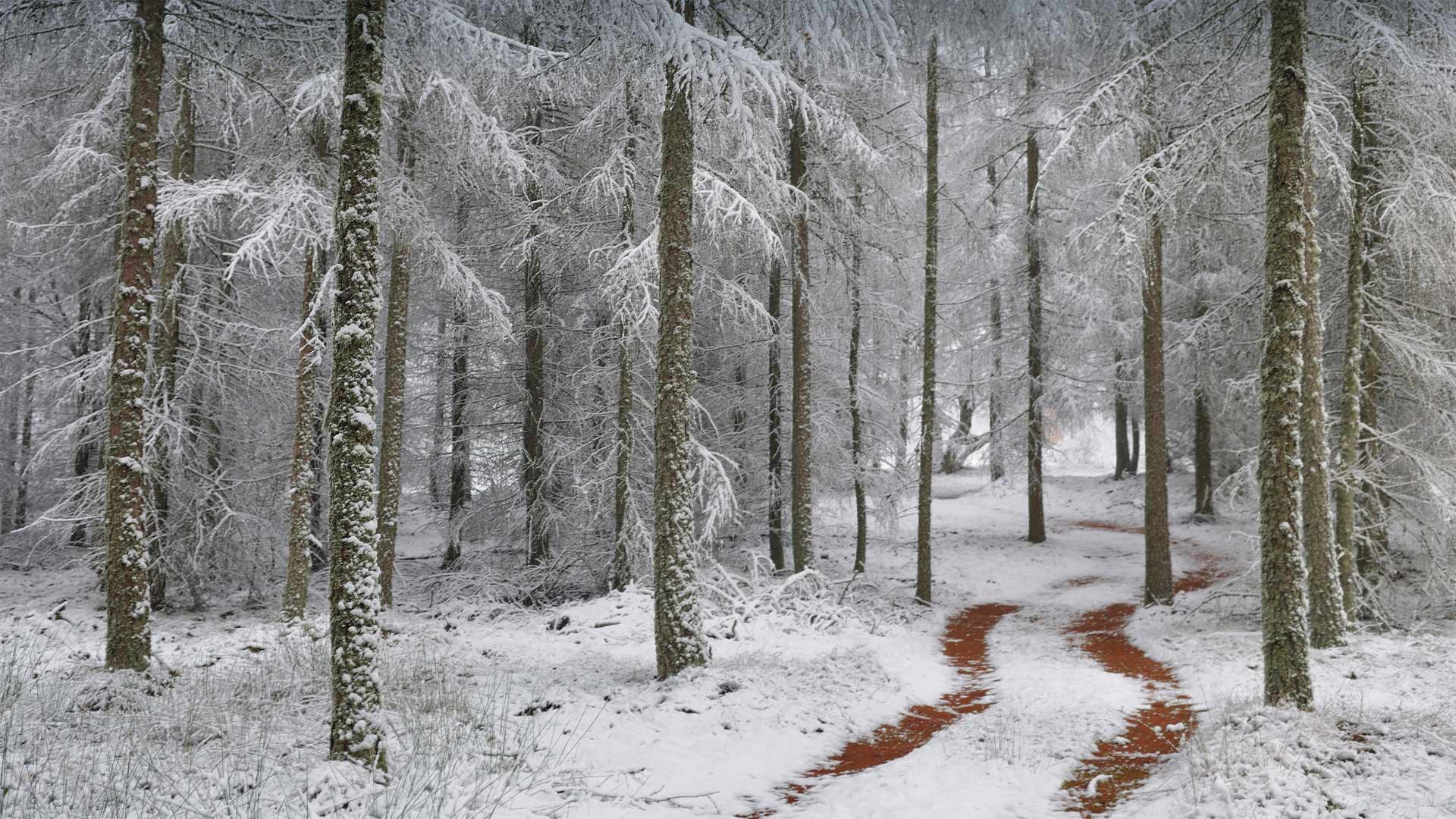 This wintry, wooded scene comes from Northern Vosges Regional Nature Park in northeastern France, one of the country"s most beautiful and pristine examples of natural beauty. The park, established in 1976, is over 322,000 acres in size, 65% of which is covered in forest. The larch trees seen here are native to many of the mountains of central Europe, such as the Alps, Carpathians, and the Pyrenees.