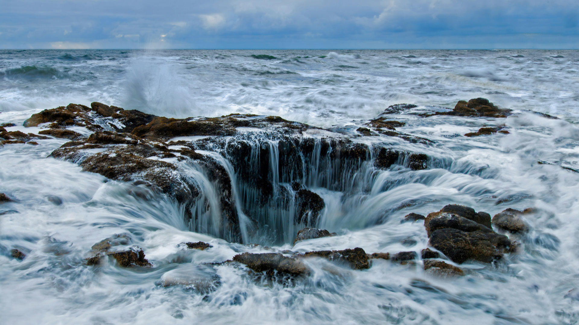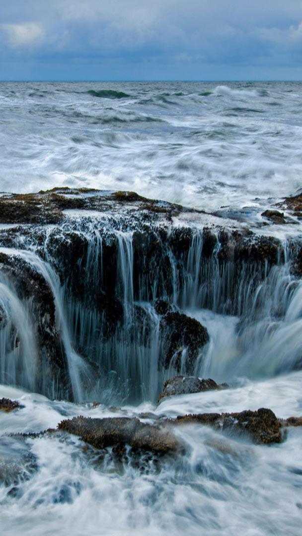 We are standing here on the craggy Oregon coast looking out to Thor"s Well with the help of a photographer"s telephoto lens. Only the most daring of visitors would get this close to the gaping sinkhole at high tide. One misstep combined with a forceful surge from the raging Pacific Ocean, and into the plunging well we"d go.