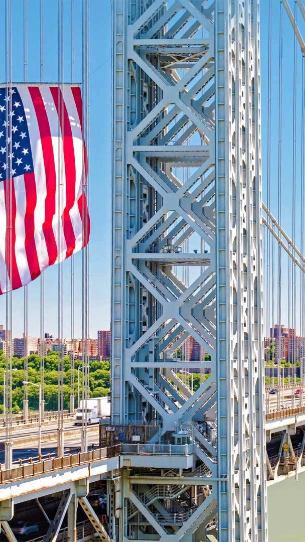 Because it"s Flag Day in the US, we"re at the site of what"s believed to be the largest free-flying US flag in the land. It"s crowning the George Washington Bridge connecting Manhattan with Fort Lee, New Jersey. For those crossing the Hudson today, Old Glory will be on full display on the New Jersey tower, at least between the hours of 7 AM and 1:15 PM, after which New York Port Authority workers will reel the 60-by-90-foot, 450-pound nylon flag back into the tube where it"s housed, suspended hundreds of feet above the busy crossing. The flag is set to come out again on July 4, and if you can"t catch it then, you"ll still have a chance to see this enormous flag a few more times this year, as it is scheduled to fly again on Labor Day, September 11, and Veteran"s Day.