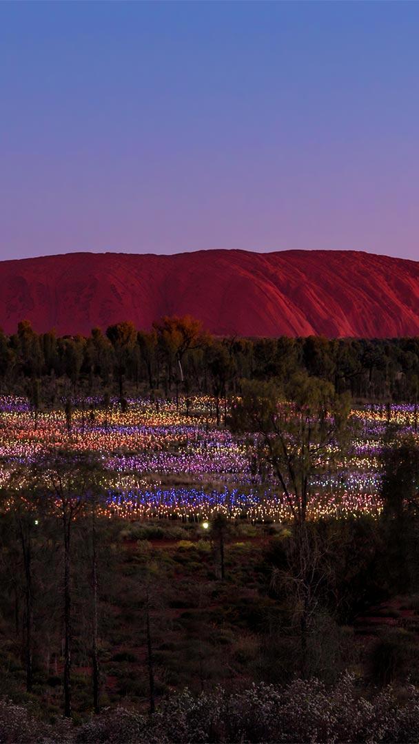 This landmark of the Land Down Under is usually pictured in sweltering desert sunlight. Now a 21st-century addition near the ancient rock of Uluru has people flocking here even at night.