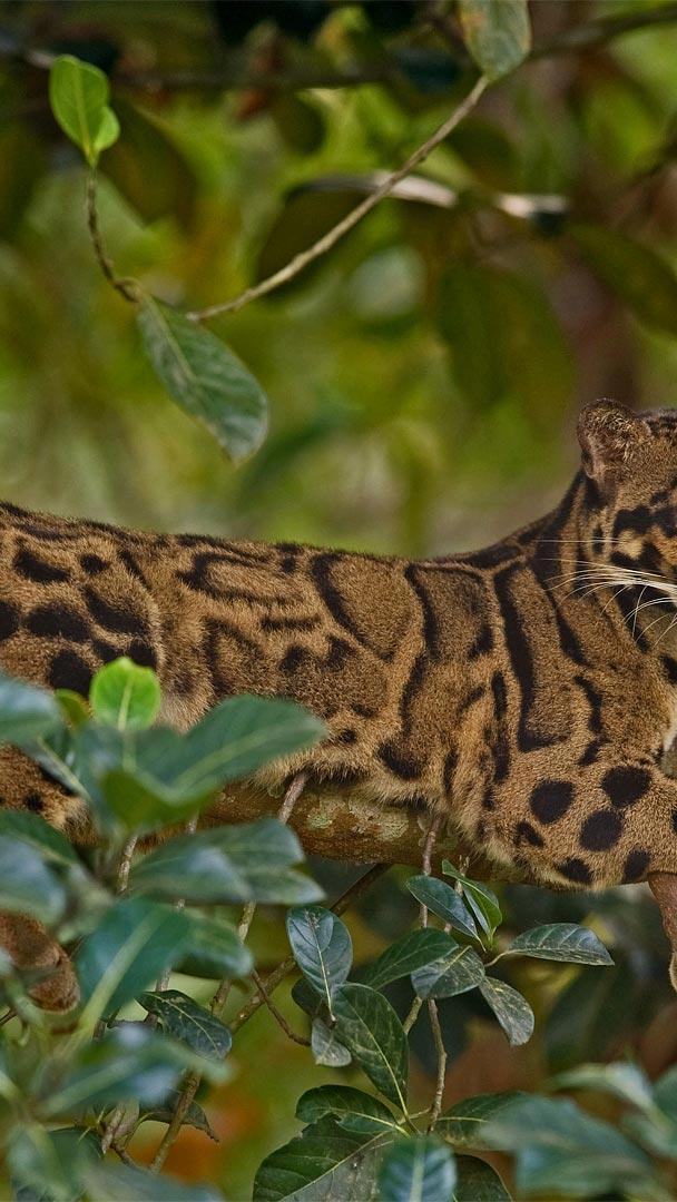 With short, limber legs and a long tail, the clouded leopard is perfectly adapted for living in the trees. Flexible ankle joints allow it to descend trunks headfirst, one of only two cat species that can pull this off. A long tail provides stabilizing balance for leaps between trees. Sharp, retractable claws let this jungle climber dangle off branches in all sorts of gravity-defying positions.