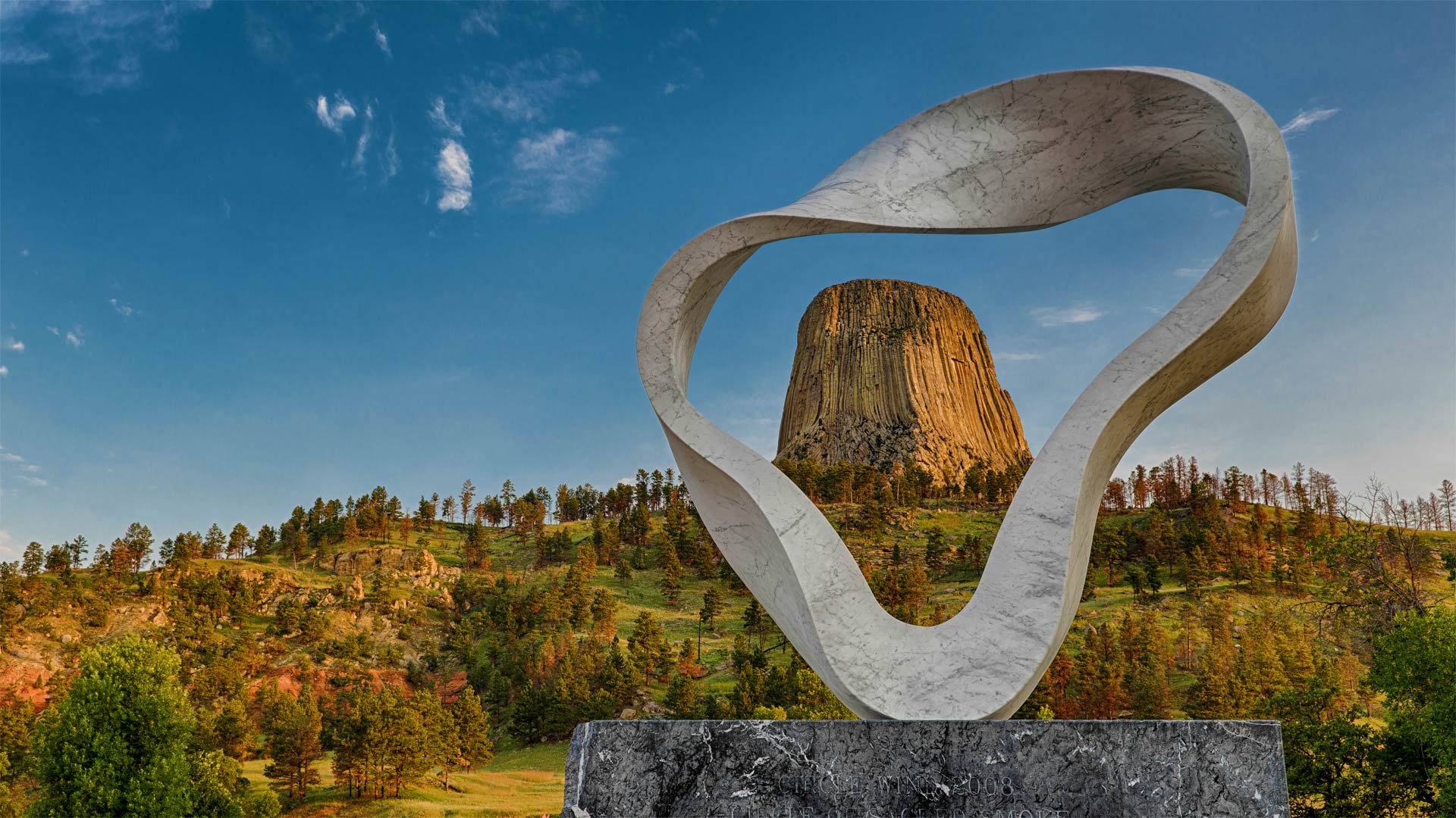 We"re celebrating Indigenous Peoples" Day by peering through the sculpture called "Circle of Sacred Smoke" aka "Wind Circle" or "Circle Wind" at Devils Tower, one of the most famous rock monoliths in the US. The "Circle," sculpted by Japanese artist Junkyu Muto and installed in 2008, is the third of seven "peace sculptures" placed around the world. Twelve feet high and made of white marble, it"s intended to evoke a puff of smoke from a Native American ceremonial pipe.