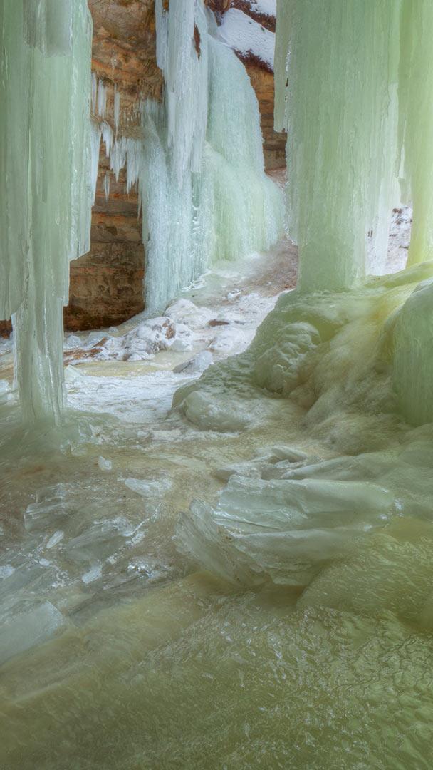 The Eben Ice Caves only exist during the freezing winters of Michigan"s Upper Peninsula. For the rest of the year, there are only sandstone cliffs and cedar trees here. But when temperatures drop, water flows over the canyon cliffs and turns into these beautiful, colorful ice formations.