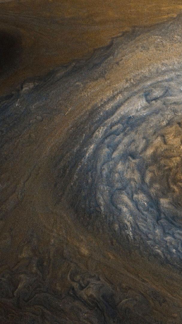 NASA’s solar-powered Juno probe took this photo of a massive storm near Jupiter’s north pole. Juno’s been collecting data and taking incredible photos of Jupiter since 2016, showing us detailed evidence of the turbulent atmosphere surrounding the largest planet in our solar system.