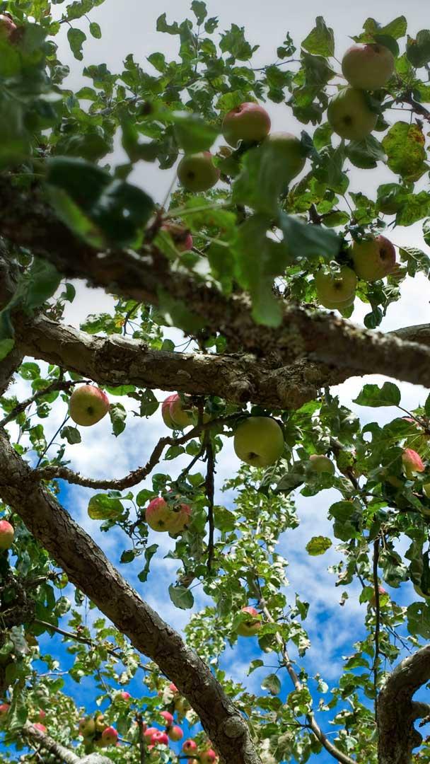 Apples can be traced back to the mountains of Central Asia. In late 4th century BCE, Alexander the Great was busy conquering that region, and while in what is modern-day Kazakhstan he came across wild apples. Alexander’s military machine brought some of the plants back to Europe, and over the centuries, cuttings and seed splices began to produce the fruit as we know it now. The apples ready for harvest in this photo are on Salt Spring Island in British Columbia, Canada—a long way from Central Asia.