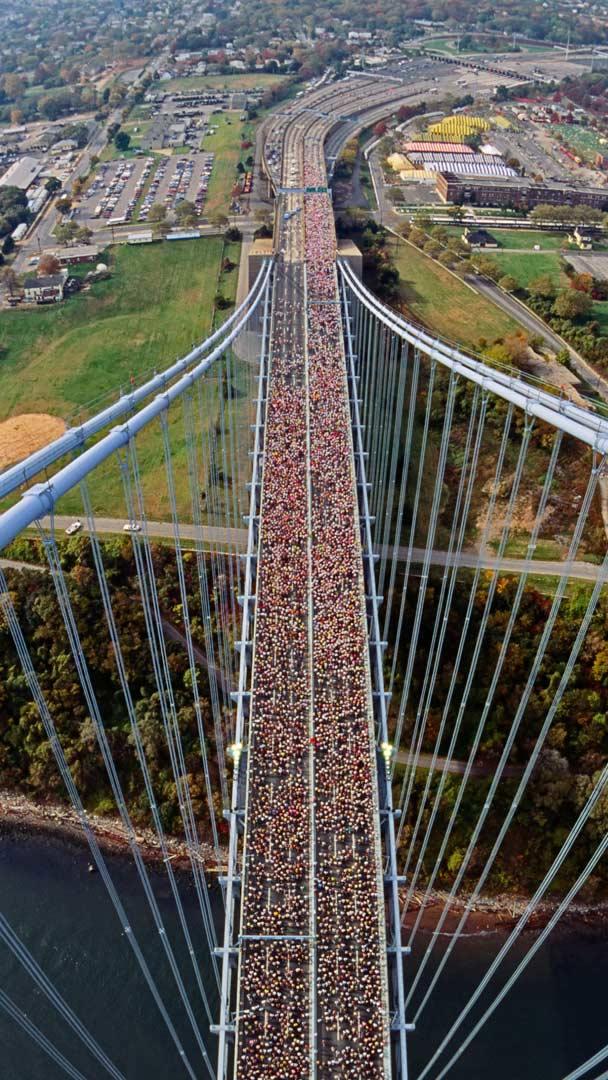 The route for the 2018 New York City Marathon starts right here at the Verrazzano-Narrows Bridge, crossing from Staten Island into Brooklyn, before eventually coursing through all five boroughs of New York. This photo—taken by a camera drone—shows just how many people will be running in today’s race. Because the race starts early on a typically cold November morning, many runners show up in layered clothing. But once they heat up from running, those layers come off and are often discarded on sidewalks. Race organizers collect tons of items left behind and work with charities to donate the activewear.
