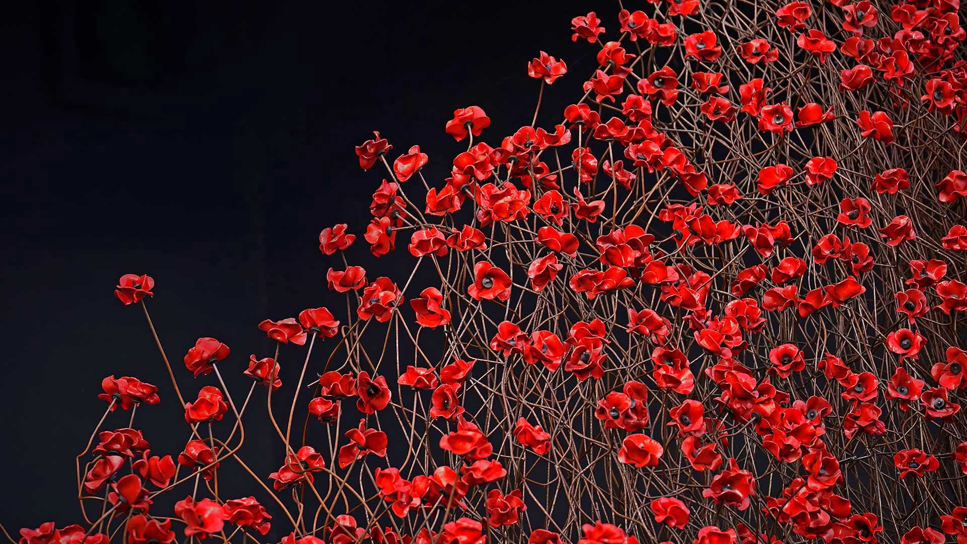 This is part of ‘Blood Swept Lands and Seas of Red,’ an art installation created by Paul Cummins and Tom Piper to commemorate the 100-year anniversary of World War I. Crafted of thousands of ceramic poppies, the touring exhibit has been seen by more than 4 million people in 16 locations around the United Kingdom. One large section of the installation, ‘Wave,’ is currently at the Imperial War Museum North in Manchester, England, which is where our image was photographed. We’re showing it today to honor Armistice Day, the day exactly 100 years ago when the Allied Forces and Germany signed an armistice that ended the war. The US renamed the holiday Veterans Day in 1954 to honor veterans of all its wars. To the roughly 20 million veterans in the US today–thank you.