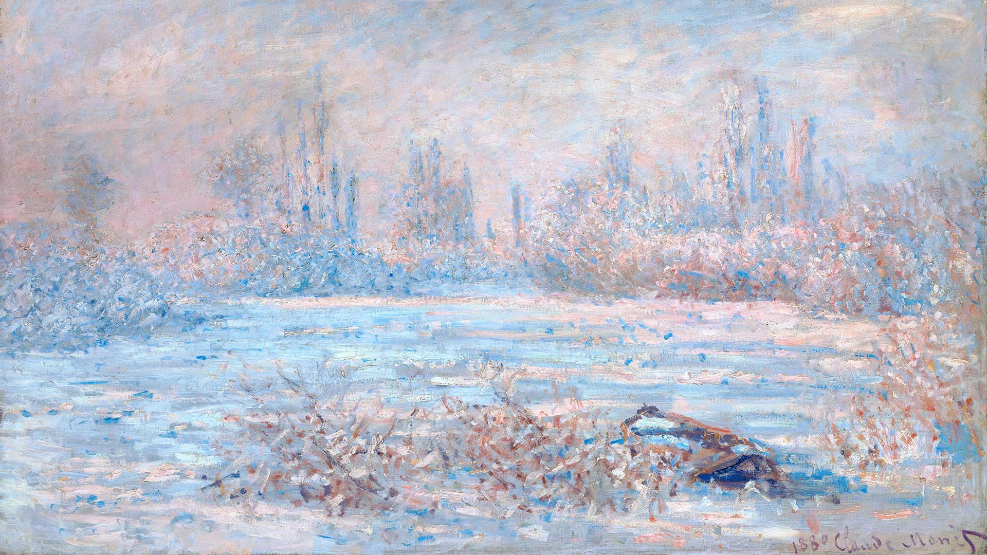 Was there frost in your neighborhood this morning? More than 100 years ago, impressionist painter Claude Monet painted this wintry scene, called ‘The Frost,’ in the French commune of Vétheuil, where he lived from 1878 to 1881. We’re showing it today in honor of his birthday. Monet is considered a father of impressionism, the artistic movement characterized by thin brushstrokes and depicting the visual impression of the moment–especially in terms of light and color. The term impressionism derives from a review of Monet’s painting ‘Impression, Sunrise,’ which he exhibited in 1874. Happy birthday, Claude!